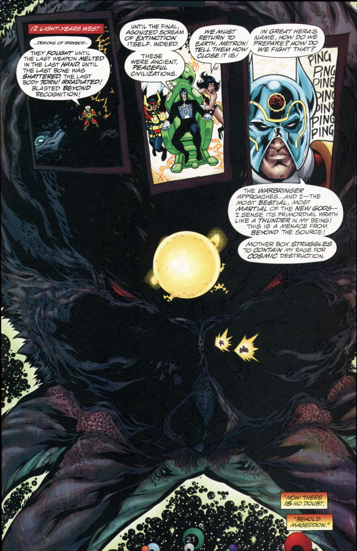 Morrison was the perfect guy to illustrate this because he is a concept engine. We’re going to get into this in greater detail as the column goes on, but dude comes up with some crazy stuff, huge threats that could only be beaten by the most powerful being on Earth. Do you want to see the JLA versus some corrupted angels? Issues 6 and 7 give that to you. Are you liking Snyder’s current Legion of Doom in Justice League, with Luthor searching for a weapon of ultimate power? Morrison did it first in the Rock Of Ages storyline and threw in some dystopian future stuff with Darkseid (that was my first introduction to Darkseid, and I fell in love immediately). Corrupted Fifth Dimensional Imps? They’re there. The Justice League of the 853rd century and their arch-nemesis, a giant solar computer? They’re there. The ultimate evil at the end of all things? You better believe it’s there.