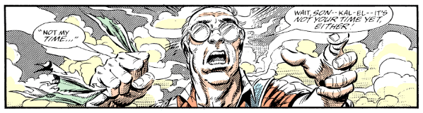 The beautiful thing about this comic is that it plays the afterlife utterly straight… while also not actually ever saying if it was real. The pages of Jonathan Kent and Clark going on a bogus journey through the afterlife are colored with faded tones, focusing mostly on green and yellow to give a strange unearthly tone. Everyone working on this book were working on full steam, from Ordway on the script to Tom Grummett on pencils, Doug Hazlewood with inks and shading, Glenn Whitmore on colors, to Albert DeGuzman on letters. The book is wonderful and deserves any credit it can get.