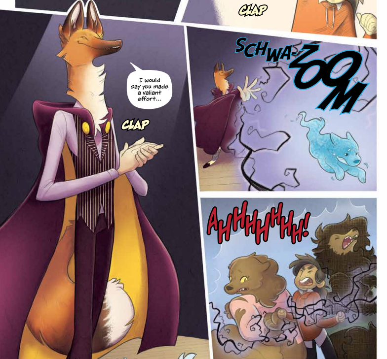 The main action of the story centers around Julie assisting her genderqueer best friend and plucky co-worker Chet. Chet is a former centaur who has been without their horse half, or in their own unabashed words βbutt,β following the theft of their magical essence from what Julie and company thought was an underground magic show in issue #2. These events have left Chet as a human, creating a game of cat and mouse (or rather werewolves and ghost) between the intrepid heroes and magic stealing renegade magicians. But again these occurrences are not as Julie would have them, she does not enjoy things like the supernatural. Magical premonitions, spooky situations, and most importantly the stress and pressure of helping Chet cause her great panic and emotional suffering.