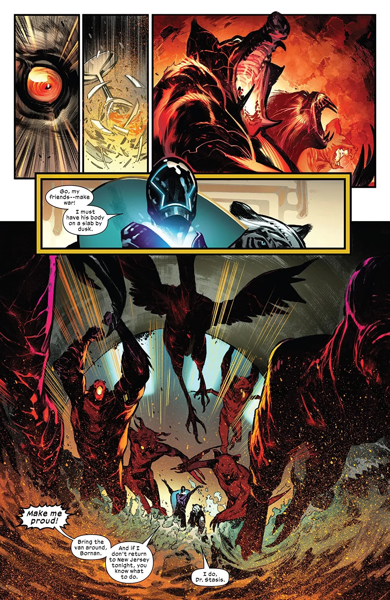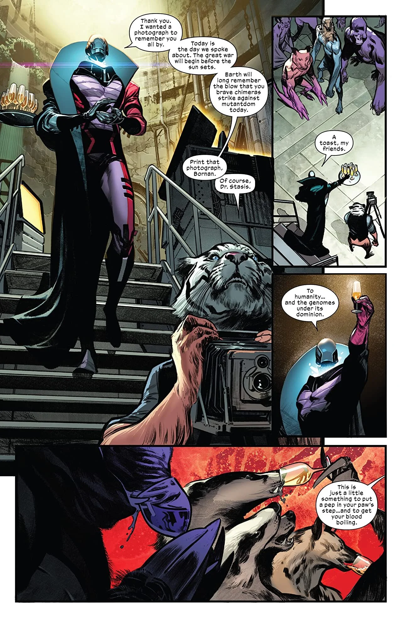 The issue is all about how Cyclops died. It moves from after he's been resurrected, where he has a talk with Emma and learns about the Captain Krakoa costume. It showcases the battle that killed him as well. Stasis sends hybrid animals after the X-Men. They rampage through New York City, and Cyclops, Synch, Wolverine, and Sunfire tackle them. One of them is able to injure Cyclops, and Stasis, posing as an EMT, finishes the job but not before telling Cyclops where to meet him when he comes back.
