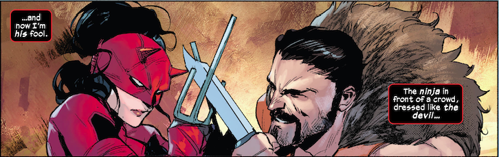 Zdarsky cleverly executes the battle between Elektra and Kraven. It's way too easy for any writer to square hero against villain and let the rest fall into place from there. Zdarsky has a keen perspective on two different fighting styles and the way that they would engage in an open fight...and he manages to make it conceptually interesting, which is rarely the case with most combat in action fiction. The overall composition and pacing of the issue is well-thought-out. A brief intro and closing scene flank 9 pages of action that slide gracefully through a couple of different locations.
