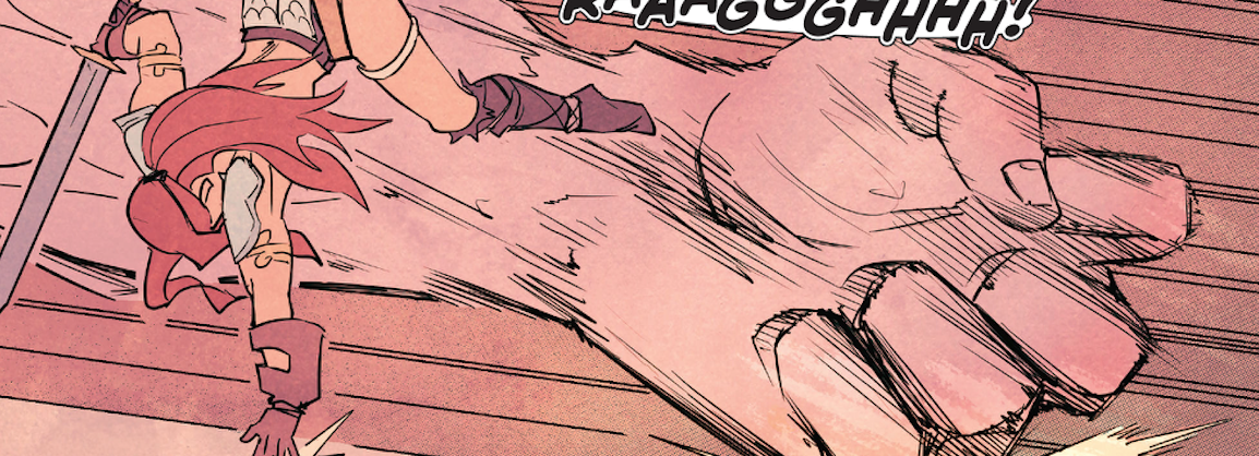 Labradaβs manga-inspired rendering of the iconic Red Sonja gives the rubbery spoof of the story a warm springiness that feels dynamic enough to carry the story through the initial weirdness. Labradaβs delivery of the action is satisfyingly kinetic. The drama has a suitably heavy feel about it without ever taking the story as seriously as it could have been. Labrada rolls with the tumble of Clarkβs mood quite well. With very little in the way of background outside of establishing shots, Diazβs color aptly sets the tone for anger, action, and moodiness throughout a fun, little adventure.