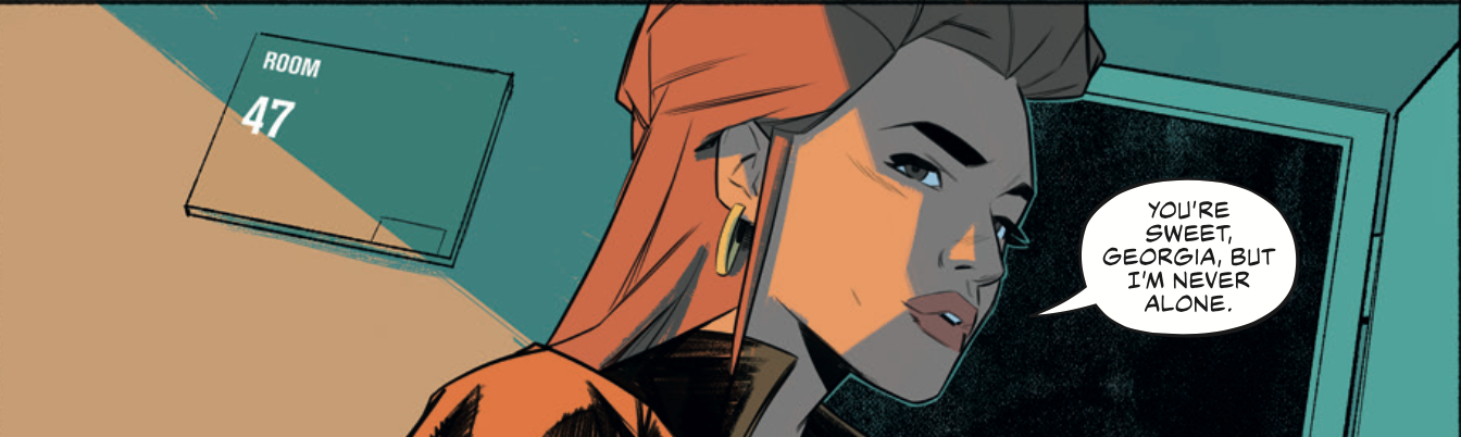 Carlomagno’s sleek visuals slide across the page. The inner turmoil slashing around inside Bibiana doesn’t feel all that present on the page. There’s a stillness even to the action that seems to speak to a desensitization in and within the heart of the main character. Bibiana IS interesting, but it will take some time for Carlomagno to construct the right visual language to allow the reader into her mind. Iacono’s colors feel clean and splashy with lots of cool purples and greenish blues. Dead Lucky’s San Francisco is a nice place, but it feels a little washed-out and lo-res.