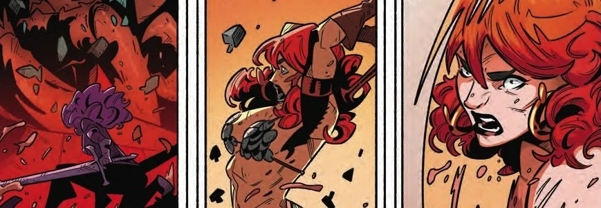 The She-Devil with a Sword has a squire. He’s a bit concerned about her. She’s not quite herself. She killed a beast while his back was turned...and she’s leaving her sword in its back. When he asks her about it, she speaks of a “sword shop” where she might get another. It’s quite strange and it’s about to get stranger in Sonja Reborn #2. Writer Christopher Priest continues an appealing new angle on Sonja with artist Alessandro Miracolo and colorist Giovanni Caputo. Things seem to be stabilizing for the series as the full weight of the premise settles-in.