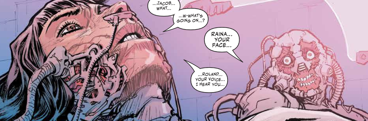 Roland Rocketfeller had run into something at work. It was bad. Really bad. So bad that he had to go back in time a few hundred years in order to escape it. Now it looks like he may be on the run in The Rocketfellers #9. Writer Peter J. Tomasi continues a pulpy cyberpunk adventure in space and time with the art team of Francis Manapul and Siya Oum. Color comes to the page courtesy of John Kalisz. A little bit more of the backstory of the series is revealed in a darkly futuristic drama set in the future that is Roland’s past.