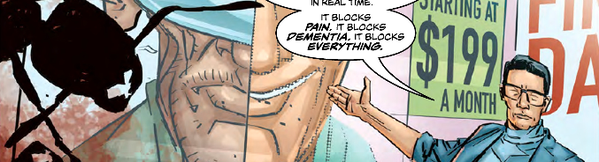Russell has developed a fun sort of a atmosphere for what it is that he's doing. The repetition of a couple of different presentations to a couple of different investors does feel a little weird. But it does amplify some of the elements of what it is that Russ is exploring. There's real potential for exploring a lot of the nature of memory. The entire premise is that you get your own memories plugged into you at the moment of your death and you relive them. Only you don't know that you're really reliving them. To you what's happening for the first time. There's a real chance for a Philip K dick style, twisting of reality with the premise. It could be a lot of fun to see where that goes if there is some kind o stinger at the end of the series. Or at least in the second issue. There's a lot of weird stuff that could be going on that would be a lot of fun.