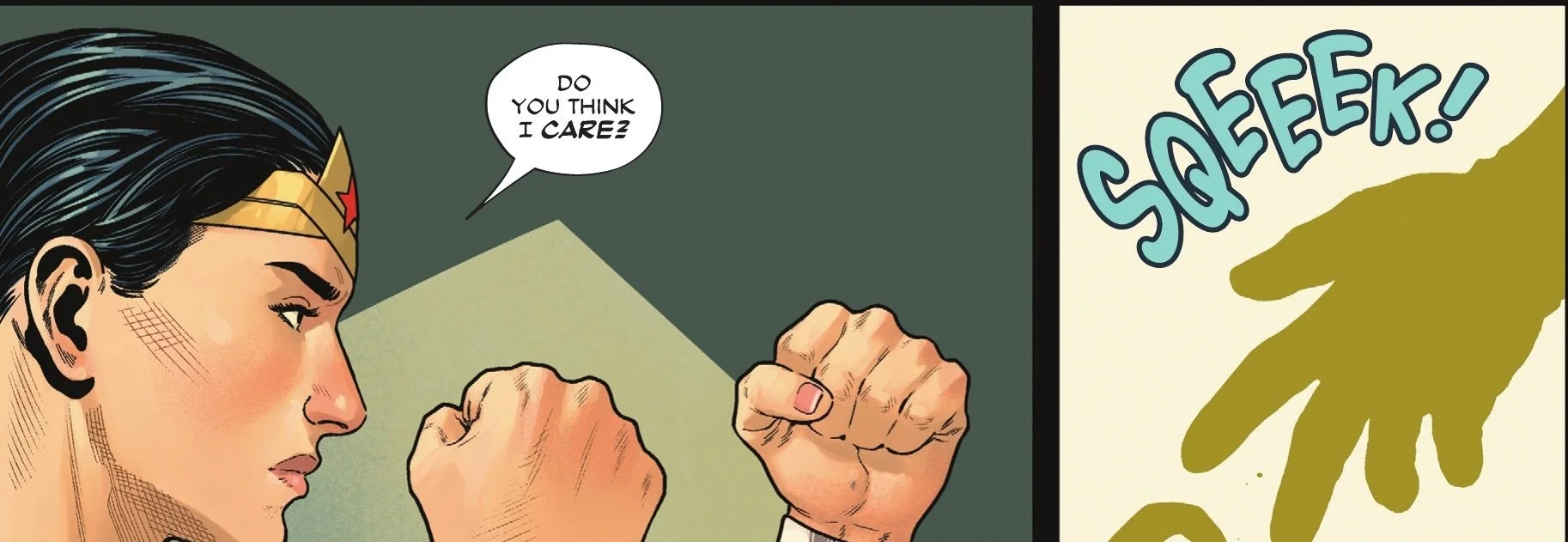 Sampere isn’t called-on to deliver a whole lot of subtlety for the 26th issue of the series. Though there IS some political and interpersonal drama making it to the page, the heart of the issues is a showdown between Wonder Woman and Mouse Man. So there’s a lot of physical aggression shooting across the page. The kinetics of the action feel quite dynamic. Sampere and Morey do a respectable job of delivering the mood with some particularly dark colors and shadow. It all hits the page with a great deal of impact as the story hits another major moment at issue’s end.