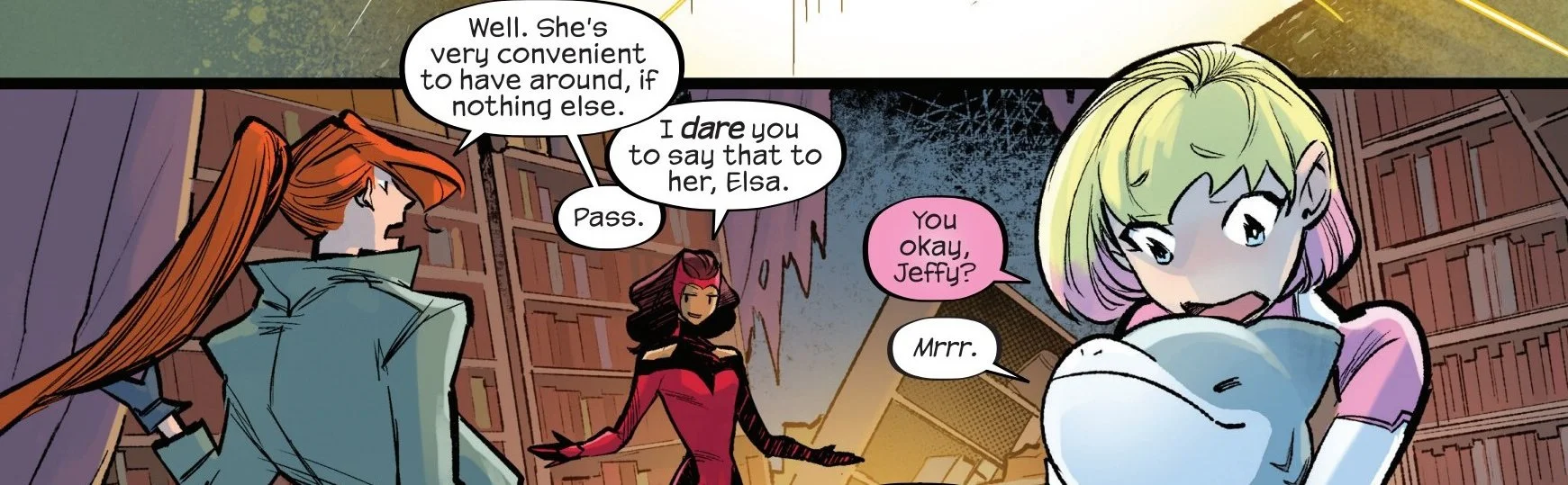 So...Dr. Strange isn’t exactly around. Thankfully, there are a lot of other people who are there to help Jeff handle the little problem he’s having with a shadow demon that looks just like him. Scarlet Witch and Magik are particularly helpful in this regard, but Jeff’s going to need to make a rather important decision if he’s going to be able to bring everything to a full and complete resolution in time for the requisite hugs and cuteness at issue’s end.