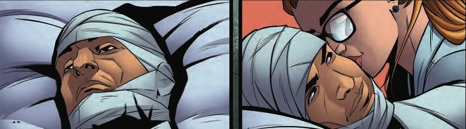 The big guy is all bandaged-up. Heβs in pretty serious condition. More or less totally immobile. OK: so it's a pretty bad situation for him, but it's not a very bad situation for a hospital. They see this sort of thing all the time. Tragically, there are people who get seriously injured. There are people who end up in fights. But this is a different situation altogether. The guy's face is covered in bandages. But normally it might be covered in a mask. He's a target in The Blue Falcon and Dynomutt #4. Writer Jimmy Palmiotti and artist Pasquale Qualano continue thier r-imaining of the classic animated Saturday Morning hero with colorist Jorge Sutil.