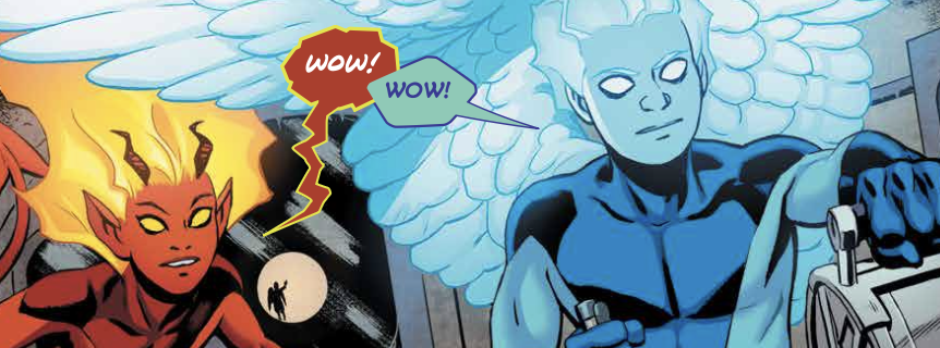 Tomasi play around with biblical fantasy with a bit of comedy. Angels. Devils. Conflict between heaven in hell. But at the center of it all really is this relationship between these two kids. These two kids have who happen to have the energy of heaven in hell behind them. And so they're going to have to make some decisions. It's not developed with as much as sophistication as it could have been. The supernatural coming-of-age drama has been done before in ways that are a little bit more interesting. That being said, the connection between the two title characters ends up being a lot of fun. This is important as their relationship really is the center of everything. All of the rest of it's just extra detail and setting that provides some context to what it is that they're doing.