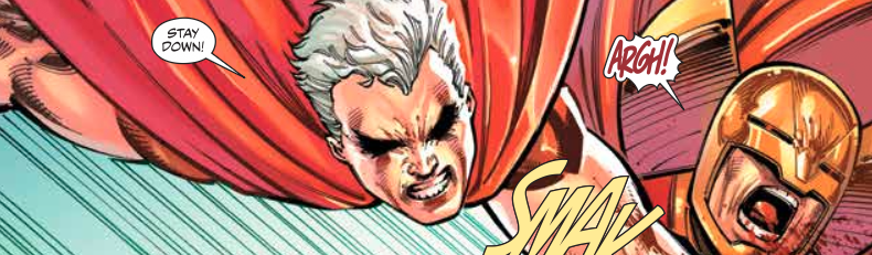 Xerxes launches himself at Supreme. Bites right into his shoulder. Draws blood and everything. So heβs a little crazy. Thatβs what makes him dangerous. Elsewhere flesh and metal collide as two combatants who look a lot like Deadpool engage in a somewhat brutal battle. There are also analogs to Superman, Superboy and Supergirl as well as The Watcher and...well...quite a few others. Xerxes has been messing with the natural flow of time and thereβs a hell of a lot going on that could really throw things into extreme instability.