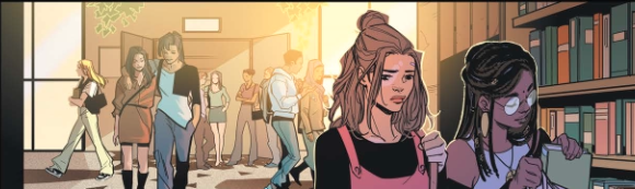 DβUrsoβs work is hugely appealing. The basic design elements hit the page with a very sharp and stylish sense of impact. Action shoots across the page with pleasantly overwhelming impact. The overall look and feel of. CΓ‘ssiaβs city and school have a very distinct presence on the page that feels absolutely gorgeous when it's really being presented in its full glory. There's a lot that's going on. That's really enjoyable. And above all there's a lot of nuance in the drama that hits the page in various different ways from posture to facial expressions to the angles that the action is being rendered in.