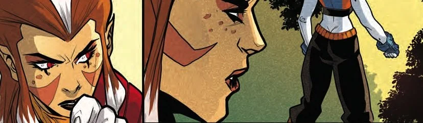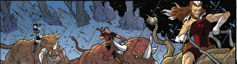 Thomasi lays-out the action with a nice sense of balance. The tight close-us of the interrogation are contrasted against the bigger ensemble scenes with Lynx-O, Pumyra and the rest. Big establishing shots anchor the action between the two different settings with a clever sense of atmosphere. The pack beasts that the cats use in their pursuit manage to look massive and cute at the same time, which is a weird kind of accomplishment in its own way. Everything seems to be working quite well for the series visually.