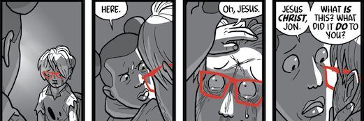 You generally don’t want to wake-up and walk out of a mine. If you have to do something like that, you generally don’t want it to be a situation where you’re walking away from a whole bunch of corpses in the process. Jon’s going to make it back into the town. He’s going to try to actually tell someone about what it is that he thingks that he might be doing. And then he’s going to go to church because...y’know...a situation like this just might turn out to be some kind of demonic thing and maybe they could help with that.