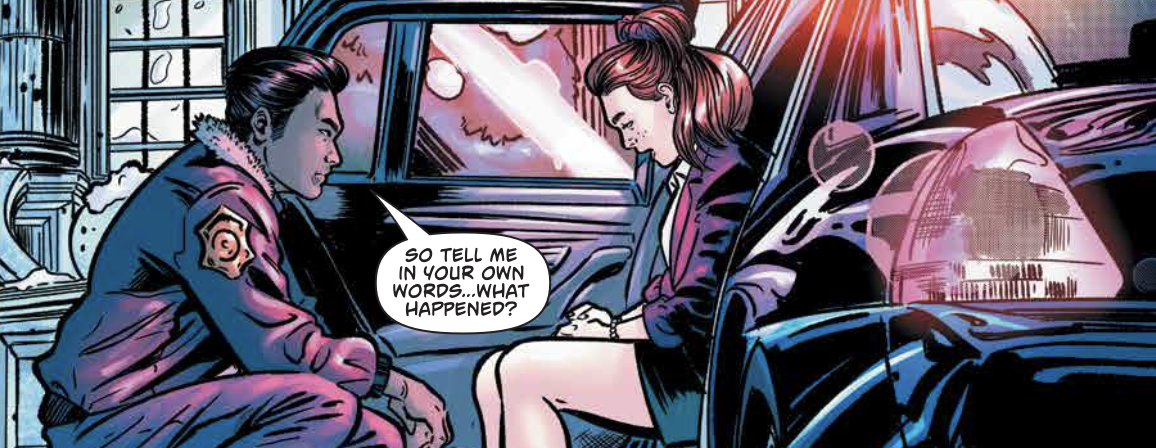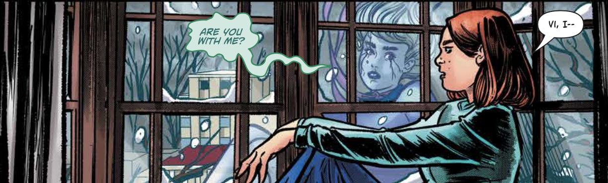 There’s a police officer who is asking Sophie a few questions. She’s not exactly in any frame of mind to be able to answer them. She wsa just there when someone died. She was there. She was talking to her. She looked back adn she was gone. All of this was happening on a balcony. The student in question had fallen off the balcony. One death is the least of Sophie’s worries in Sisterhood: A Hyde Street Story #3. Writer Maytal Zchut uhers Sophie and the ghost of her dead friend through another issue with artist Leila Leiz and colorist Alex Sinclair.