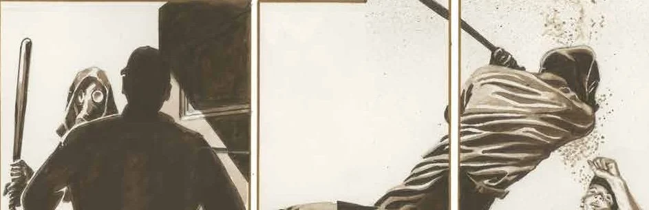 The man and the woman inside the church donβt know it, but the sound theyβre hearing outside of the church is a baseball bat thatβs being dragged across the front of the church. The gentleman collects his clothing and heads off to investigate. Imagine his surprpise when he sees a figure wearing an old gas mask from The Great War. Imagine his horror when that man attacks. The two in the church arenβt the only ones heβs going to be attacking on this particular day.