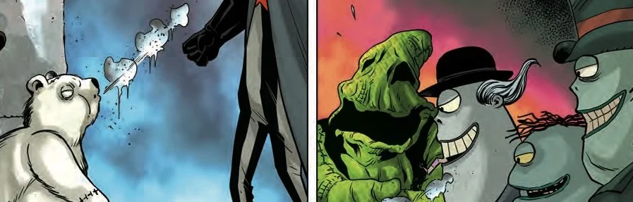 The little patchwork polar bear has eaten all of the deadroot. This puts Oogie Boogie and his accomplices in a rather uncomfortable position. What are they to do with a little, fury creature that is so cute? Cuteness is all well and good, but it’s not exactly desirable in Halloween Town. The little patchwork polar bear is going to have to think fast in The Shiver of Christmas Town #2. Writer Torunn Grønbekk continues the legends of A Nightmare Before Christmas in another enjoyable juxtaposition between the two holidays of Halloween and Christmas. The story comes to the page courtesy of artist Edu Menna.