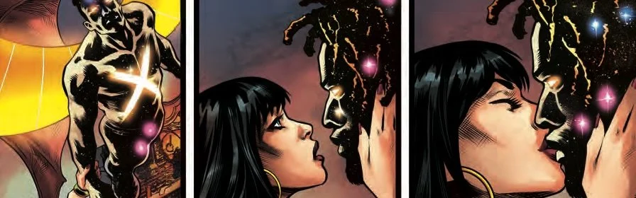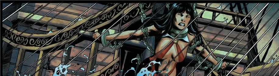 He might be calling himself Chaos. He thinks of himself as a god. She’s telling him that he isn’t. At best, he’s a deranged sentient energy field trapped inside a gravity well with a god complex. The fact that she’s saying this while serving as the unwilling maidenhead of a boat that he’s helming in 1616 is only a strange detail. She’s about to break the prow of the ship and face her captor in Vampirella #10. Writer Christopher Priest continues a weirdly fun and compellingly frenetic tale of horror fantasy that is brought to page and panel by artist Davis Goetten and colorist Adriano Augusto.
