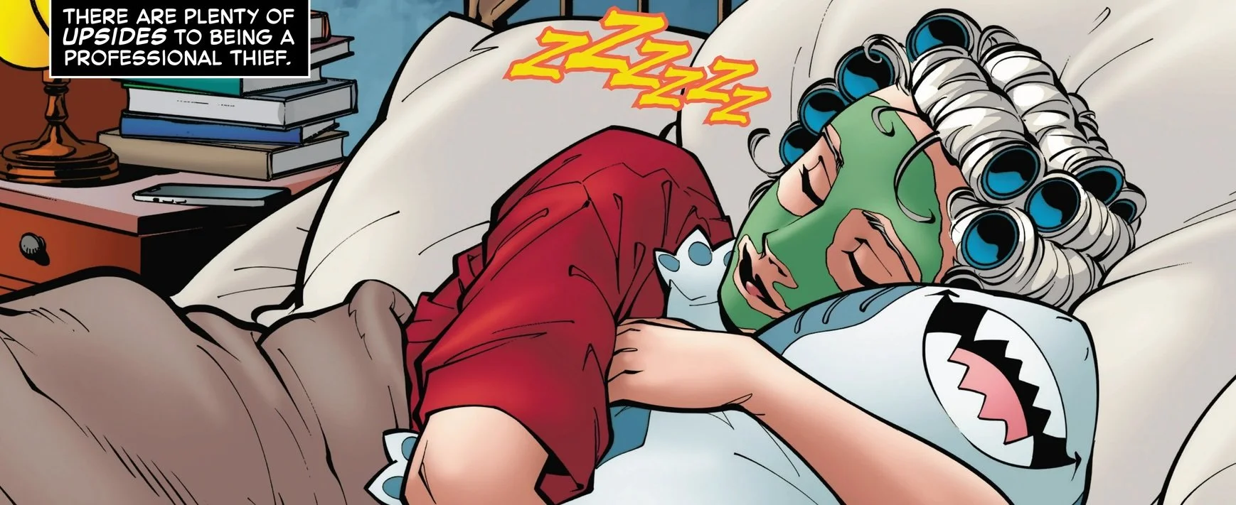 Everything seems like it’s going well for Felicia as she wakes-up. She’s had a good night’s sleep. She’s cuddling-up with a Jeff the Landshark plushy in a nice, cozy bed. There’s even a pigeon singing to her on the windowsill. Then there’s the notification on her phone. And another. And well...if there’s something about her online, she really SHOULD know better than to check the comments section. She does anyway. She knows that people don’t like her. That never bothered her before...but she’s beginning to care about a lot of things that she might not have cared about before as becomes apparent in Black Cat #7. The endlessly entertaining G. Willow Wilson writes the opening of another adventure featuring that art of Gleb Melnikov. Color comes to the page courtesy of Brian Reber.