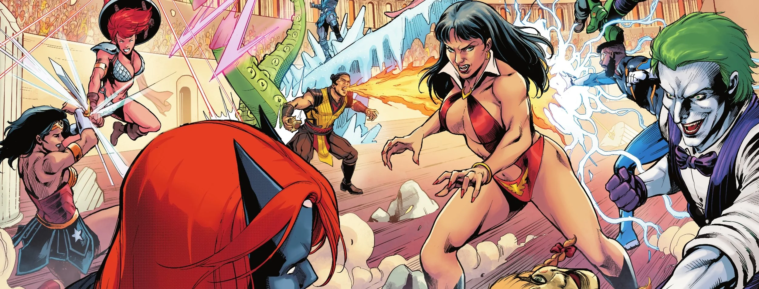 The Omega Energy that can save the world can only be acquired through conflict. And maybe what's called for is a diversity of different types of conflict which might play out over a numerous different parallel universes. Black Lightning and Plastic Man square-off in Mortal Kmobat ad Wonder Wman enters n arena with Red Sonja. Bat Woman face Vampirella while Star Sapphire goes to hang out with a teenaged witch. Superman squares off a against a twisted mutation of himself with a milk fetish while the Joker...has tea with a little doll. Hopefully everytone plays nice and it all resolves before everything crashes together and falls apart.