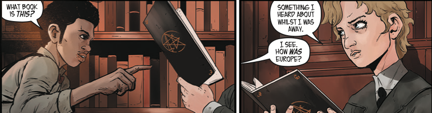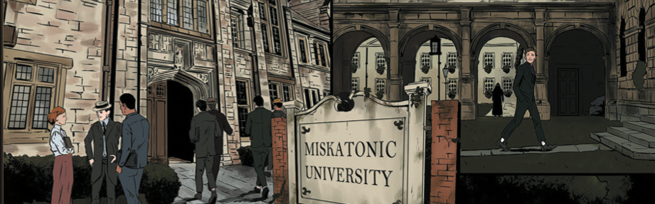 The gentleman with the gun goes by the name of Daniel Upton. βI avenge ye, Edward Derby!β (Thatβs what he said when he pulled the trigger as the guard looked-on in horror.) Upton met Derby back in 1899 at an exhibit for Selected Work of the Macabre. A few years later they meet at a reading of Edgar Allan Poe poetry. Three years ater that, Derbyβs reading a book that appears to be The Necronomicon in a library looked after by a woman who ends-up in Arkham Sanatorium years later. This is the least of Derbyβs concerns. He will come to attend Miskatonic University...