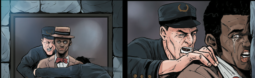 Roberts approache the page with a fairly straightforward adaptation of the script. With Lovecraft as the basis for the story, there must have been great desire to do strange things with the framing and overall coposition of the page, but Roberts has resisted skewed angles and excessive shadow in favor of something much more approachable. Thereβs a strong sense of gravity about Robertsβ rednderings that keep the narrative quite well-anchored. Itβs all a very strong. The detail on the drama eels very period-authentic in many ways. Nothing is exaggerated to any great degree. Thereβs a grand sense of composure about Robertsβ work.