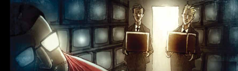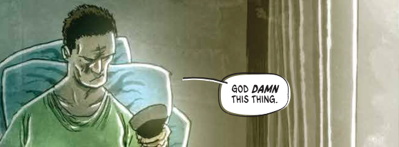Templesmith does a great deal of work in setting the mood and the tone. So much of what being delivered in the course of the issue takes place in front of a bunch of blank video monitors. The ghost glow of little cathode ray monitors serves as a very symbolic ghostly space with which to discuss the shifting nature of reality, as perceived by people trying to get information out of the mass media. By contrast, the sterile environment of a hospital pet doesn't quite have a kind of antiseptic clean, feeling that it probably should. Nevertheless, the no is carried with a great deal of poise in both of the locations. Bidikarβs lettering aids in establishing a mood. Dialogue is delivered in a very straightforward format. The switched to a.courier-inspired font for the narration adds immeasurably to the mood and tone of the issue.