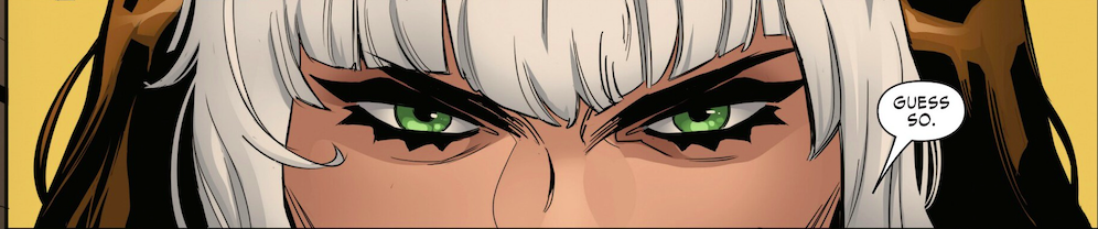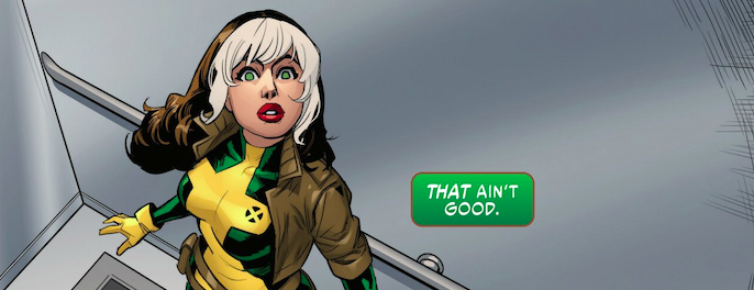 Thereβs a woman approaching an office building in Lincoln Park in Chicago. Sheβs wearing bright yellow gloves, bright yellow boots, bright yellow spandex with green trim and a brown leather jacket. Thereβs a shock of white in her auburn hair. One might expect her to look a little bit our of the ordinary in an affluent neighborhood just south of Wrigley Field, but this IS an affluent neighborhood just south of Wrigley Field in the Marvel Universe, so sheβs not going to grab much attention initially in Rogue #3. Writer Erica Schultz continues a fun walk with one of the more appealing characters in the X-Men. The story is broguht o page and panel by artist Luigi Zagaria and colorist Espen Grundet Jern.