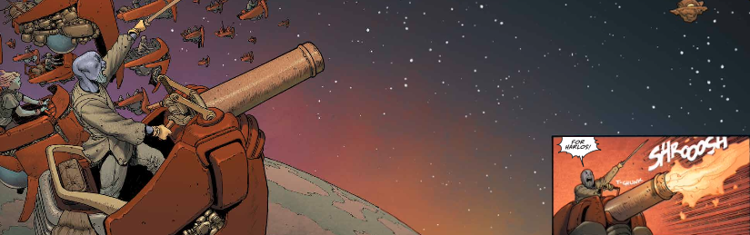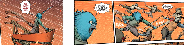 AraΓΊjo is working with a very clear gravity in the momentum of the series. On the one hand, there is a massive battle exploding on the outside of the palace. On the other hand, there is a slow and nuanced drama playing out well within the palace. The artist manages a very clever contrast between the two of them. And the assault on the palace feels absolutely gorgeous in its rendering. It's the type of thing that would've seemed much more in place in an early 20th century science fiction fantasy like Flash Gordon or something like that. Somehow AraΓΊjo manages to make it seem something other than silly, and something quite a bit more powerful than any earthbound war could. Once again, McCaigβs colors do a very sharp job of lending texture and atmosphere to the page.