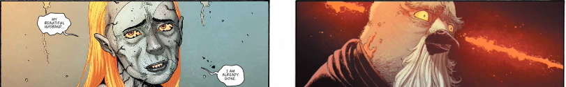 Remender works with some poetically powerful concepts which linger around the edges of the central themes. The series is drawing to a close in its penultimate chapter. Thereβs a powerful sense of intensity as the series reaches its climax. The dawn of the series is echoed through the imperfect reflection of a couple of children of the goddess on her death bed. Thereβs a grand sense of The End about everything that feels epic in the truest sense of the word.
