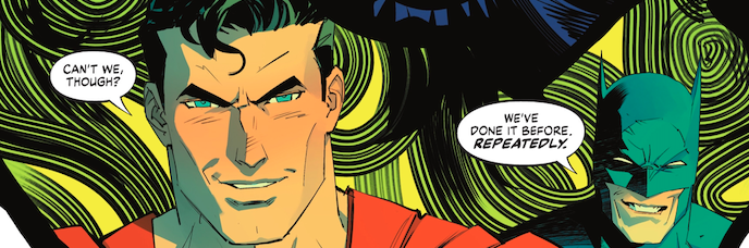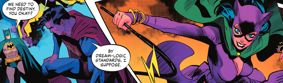 The moment they pull through into the dream realm, Clark is driving a Batmobile that’s a perfect copy of the old one from the 1960s TV show. Only it’s not a Batmobile. It’s a Supermanmobile. Things are only going to get weirder for the two of them from there. This isn’t dream tourism, though. The two heroes have work to do if anyone’s going to be able to get any sleep ever again. If they’re going to be able to do so, they’re going to have to confront each other long enough to be able to work together...