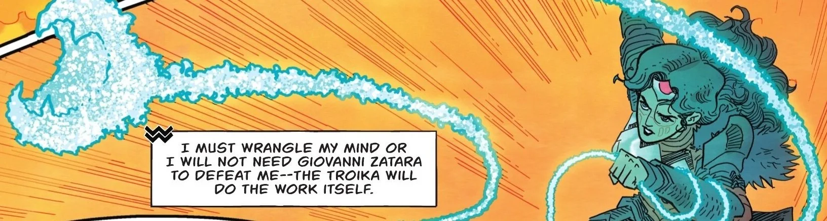 The Troika wraps around Zatara channeling right into the crossroads in which heβs imprisoned. The flaming skeletal prison that walks the Earth is being confronted by Diana, but sheβs also confronting the man within through the Troika. Sheβs trying to get him to understand the truth that heβs been avoiding. He mistakenly thinks that sheβs giving him a choice to make. In truth, he made his decision long ago. Itβs just a matter of accepting it. Diana isnβt working alone, though. Things could get complicated when his daughter Zatanna reaches out to him.