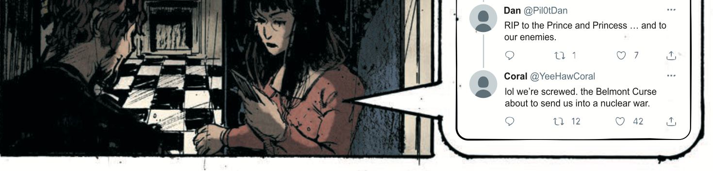 Ramsay coats every page with a scratchy inky darkness that clings to the page throughout the issue. Little flecks of ink punctuate the gutters of the page throughout the issue, adding to the gritty feel of the darkness. Generally, though, there IS a sense of decorum and formality about the fashions and the architectural rendering in the backgrounds. The shadowy moodiness of the visuals are also brought quite vividly to the page in Breckel’s colors. The color adds substantial depth in the shadow of the heavy ink that Ramsay is bringing to the page. It’s a well-articulated visual that also includes well-conceived layouts incorporating phone text chains, formal letters and impressively detailed social media screens.