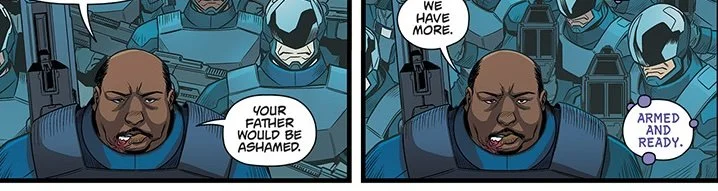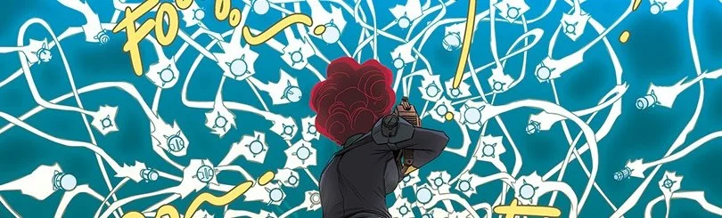 The tension of the drama that leads to the action is brought together with some very impressively oppressive visuals. There isnβt really THAT much of an establishing shot to give the full scale of one tiny woman and her huge gun against the world, but it doesnβt have to be. The wall of heavily armed policemen at the top of the fifth page is more than enough to establish the proper intensity before everything explodes in the big conflict that dominates most of the issue.