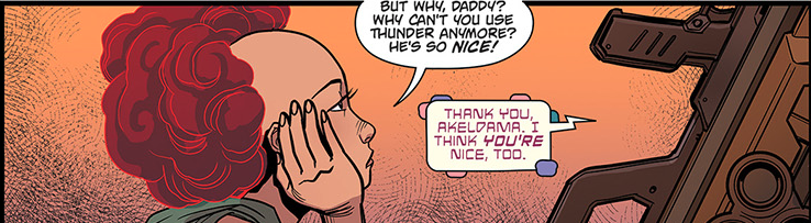 Akeldama is surrounded by the police. She had wanted to work for them at one point. Now sheβs totally against them. She knows enough that sheβs going to have to stand against them if sheβs going to be able to follow her conscience. Even with the advanced tech tat sheβs got, thereβs no way that sheβs going to be able to make it. Sheβs going to need a miracle in Blood & Thunder #12. Writer Benito Cereno and artist E.J. Su reach a major turning point in their story. Color comes to the page courtesy of Msassyk. With all of the drama firmly anchored-into the series, Cereno and company allow the action to explode across the page in a satisfying collision.
