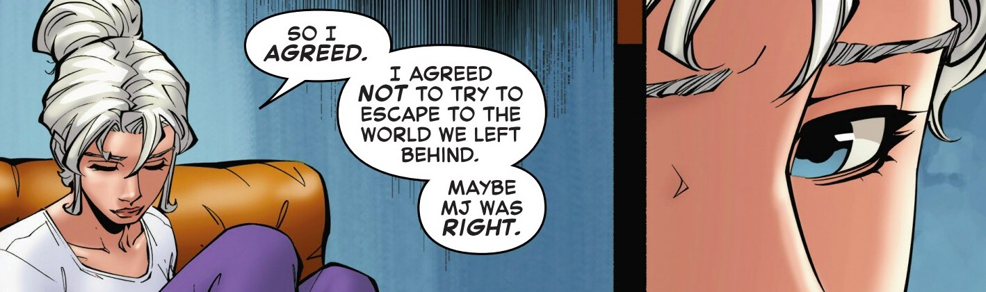 There’s usually a steady, even-tempo to a mainstream superhero comic book. The fundamental nature of the sequential art medium has a tendency to cause everything in an issue to play-out in real time. It takes 20 minutes for you to read. That’s about 20 minutes for the characters too. Wilson’s genius for the 9th issue of Black Cat? The story plays-out over the course of a few decades in a pocket dimension...and not just for a gag. Wilson really allows Felicia a stable life. M.J. too. It’s a charmingly fascinating exercise.